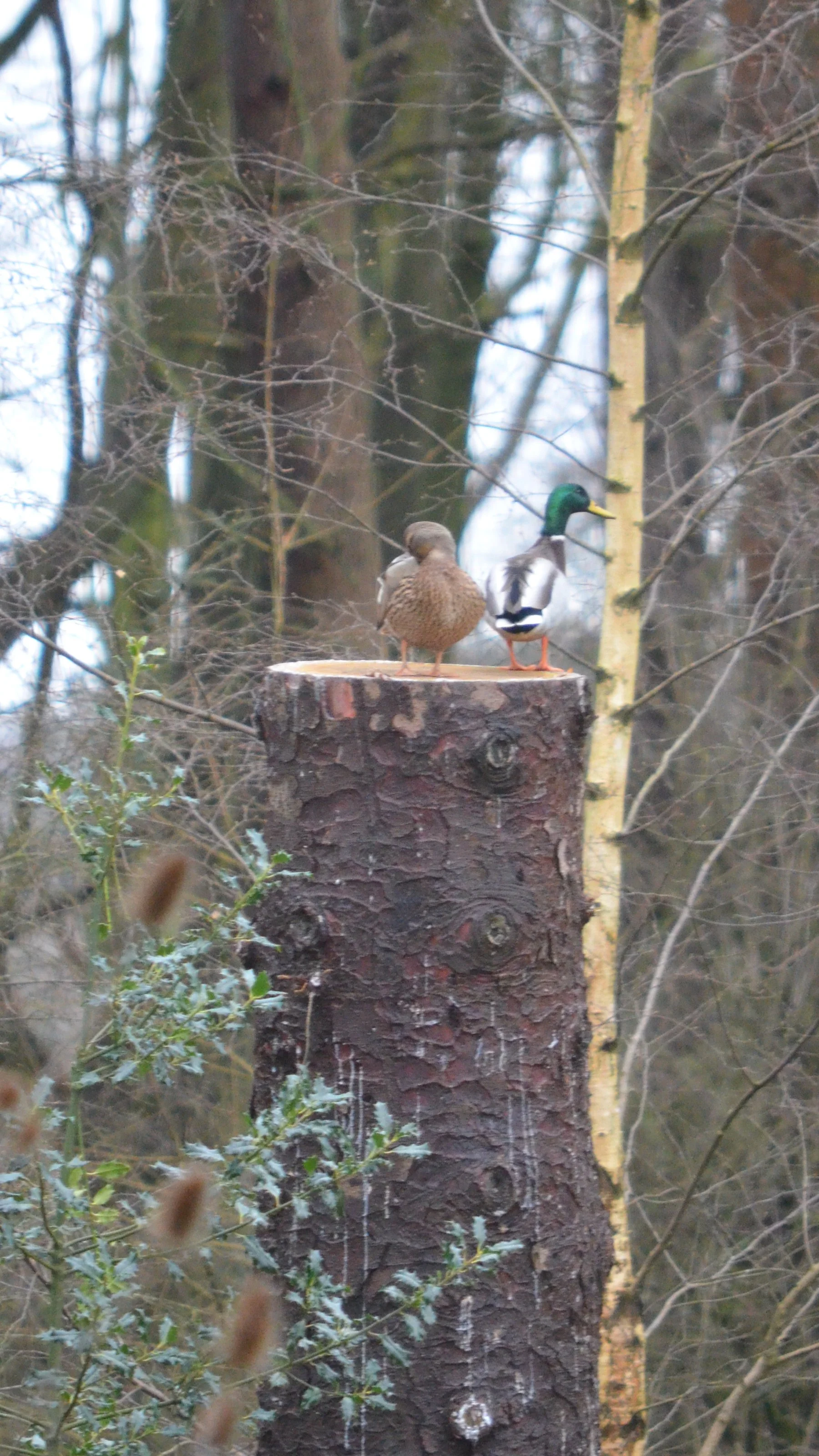 On a garden stump a pair of mallards perched together, prospecting for nest sites. We were reminded of the section in Bitch by Lucy Cooke that detailed how mallard females, when subjected to unwonted sex from amorous males can, by mysterious jiggerypokery, send unwelcome sperm into internal cul-de-sacs so that only her chosen male fertilises her eggs.