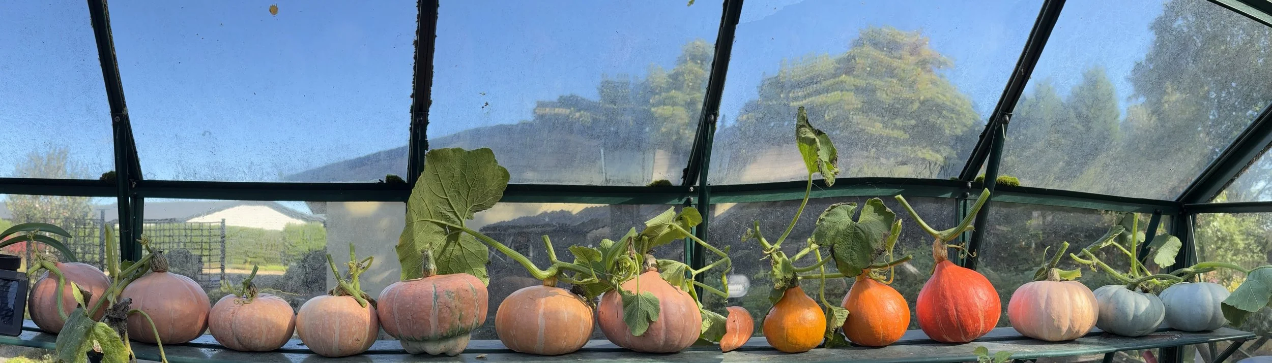 Crown Prince, Autumn King, Uchiki Kuri and, mysteriously, a Turks Turban. Mysteriously because we didn’t sow any seed of this variety. Welcome all-the-same as it is an heirloom