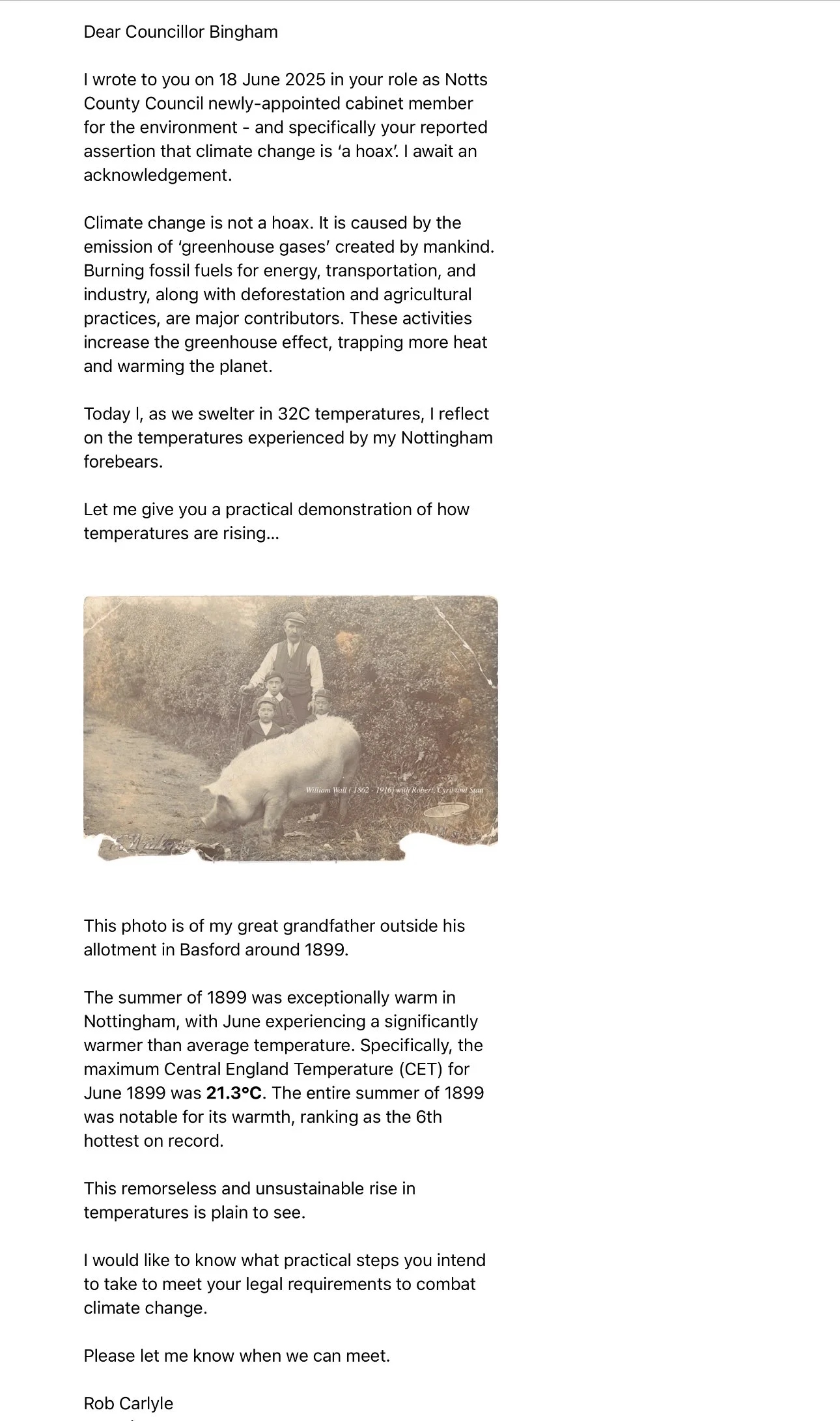 Bert Bingham, Notts County Council cabinet member for the environment described climate change as a ‘hoax’ in a recent interview.